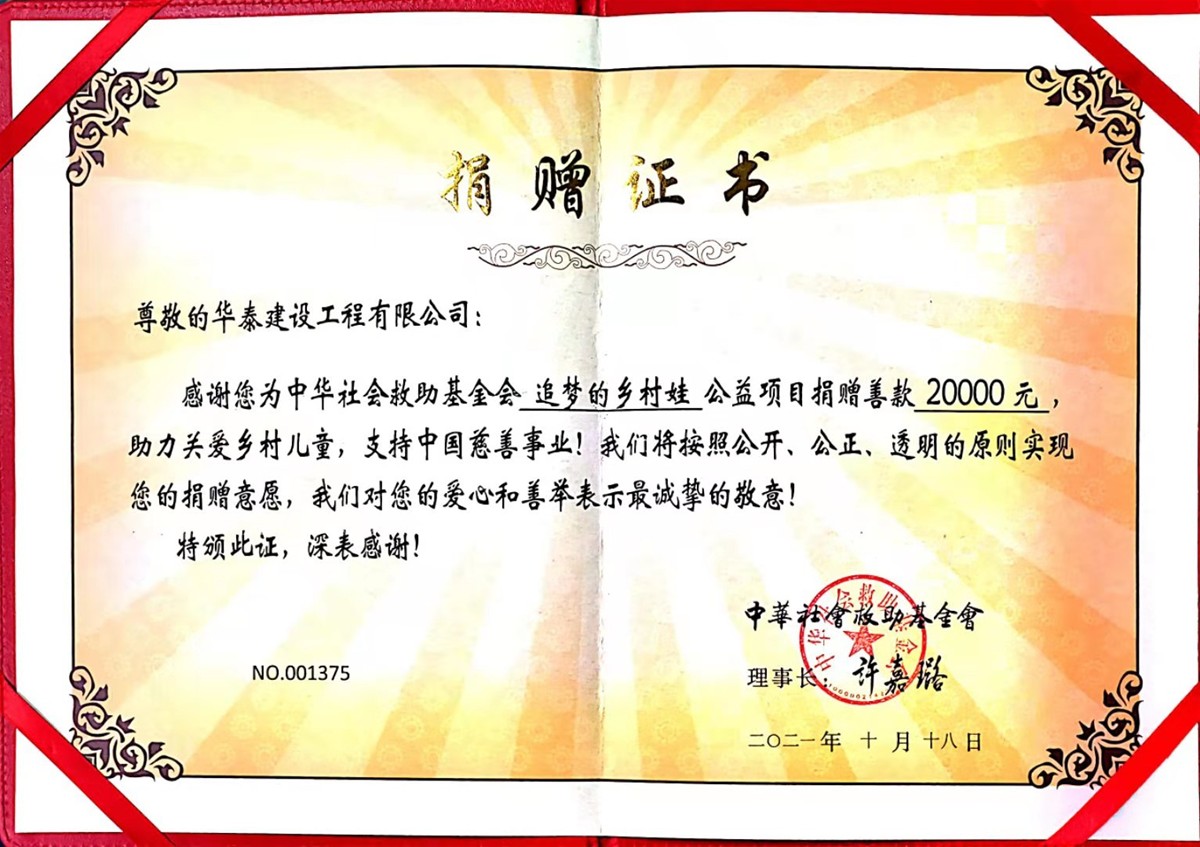 2021年10月18日,易游官网登录入口_易游(中国),向中华社会救助基金会“追梦的乡村娃”公益项目捐赠善款20000元。